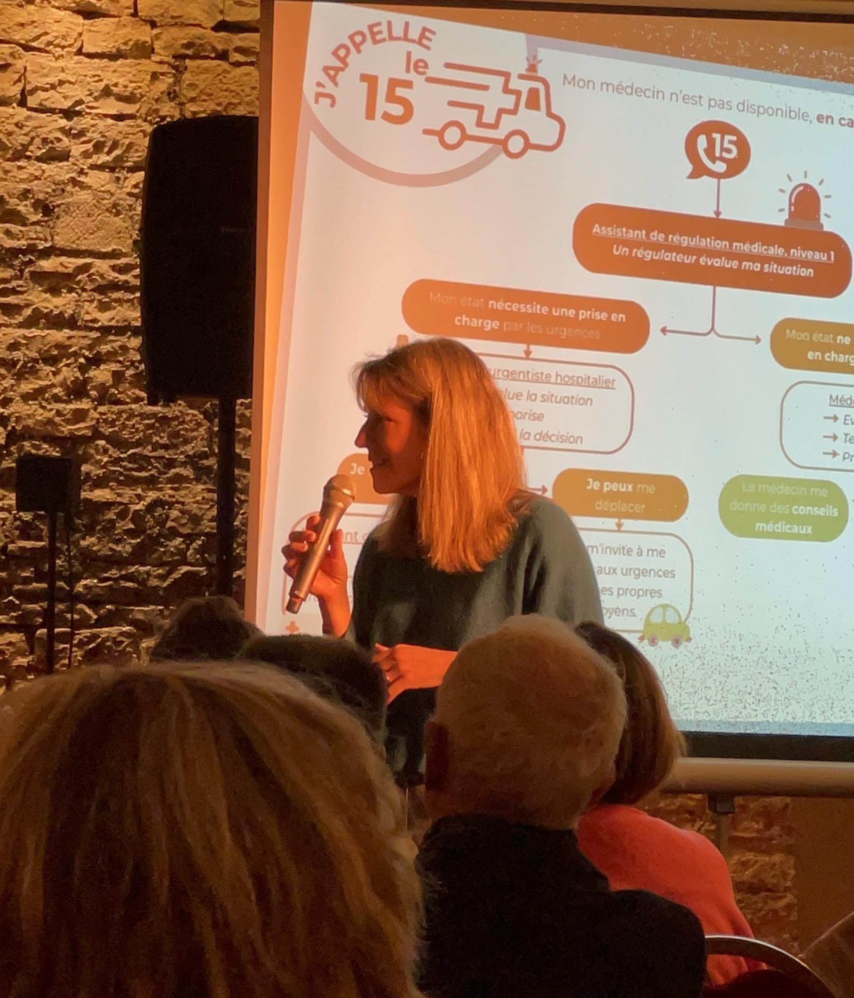 Chaque saynète était ainsi suivie d’un temps d’échange avec une table ronde, réunissant des acteurs clés du territoire : le Dr Vaillant, médecin de ville à Seurre et membre de la CPTS Sud Côte-d’Or, le Dr Balet, médecin régulateur au SAMU 21, le Dr Canel, cheffe du service des urgences de Beaune, M. Gaillard, représentant des usagers du Centre Hospitalier de Beaune, et M. Jassiones, infirmier chef du SDIS 21.
